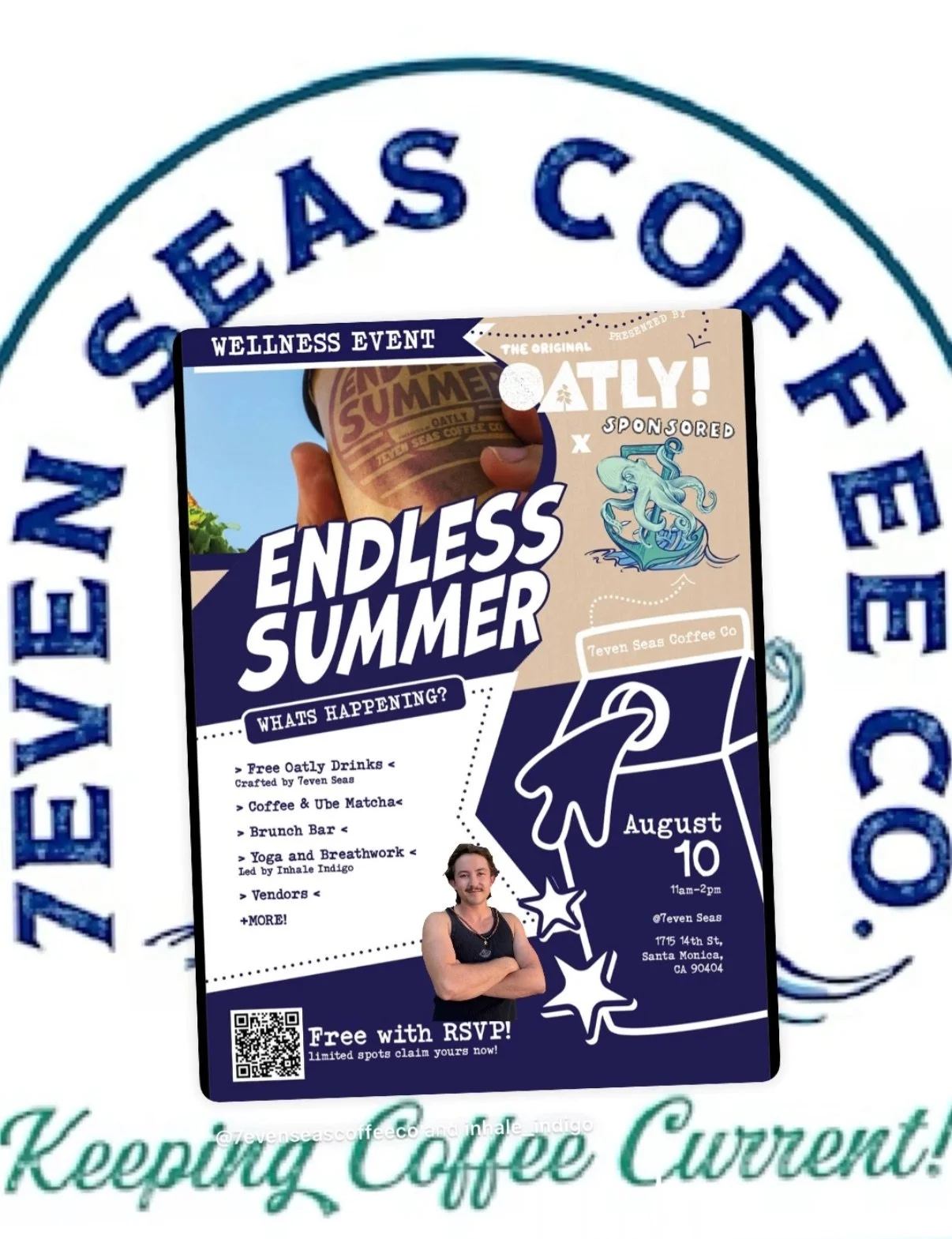 FREE Oatly Yoga Event at 7even Seas!! Sunday, August 10, 2025 11:00 AM 2:00 PM 7even Seas Coffee Co. 1715 14th Street Santa Monica, CA, 90404 United States (map) Google Calendar ICS FREE YOGA AND COFFEE AND GOOD VIBES! Sponsored by Oatly! SIGN UP - FOR FREE